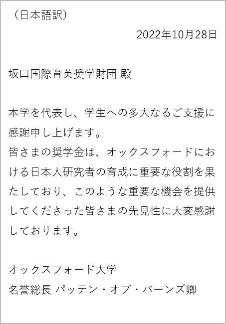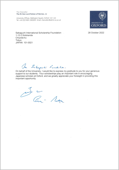 2022年11月10日 オックスフォード大学より感謝状 この度オックスフォード大学名誉総長クリス・パッテン卿から当財団の支援に対する感謝状を拝受いたしました。2019年度よりオックスフォード大学博士課程に在籍の日本人留学生への奨学金支援を行っております。